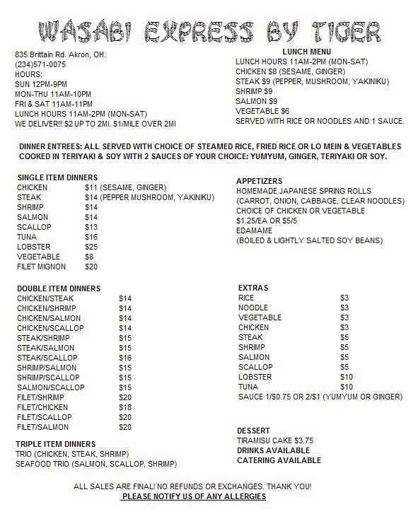 Welcome to Wasabi Express - 6 Corners, your new go-to spot for authentic Japanese cuisine in Akron, OH. Nestled at 835 Brittain Rd, this vibrant eatery offers a delightful array of dishes, each bursting with flavor and freshness. The menu features enticing options such as the Chicken Sesame and Steak Pepper Mushroom, paired with choices of steamed rice, lo mein, or teriyaki vegetables. Don’t miss the homemade Crab Rangoon or Spring Rolls for a perfect start to your meal.